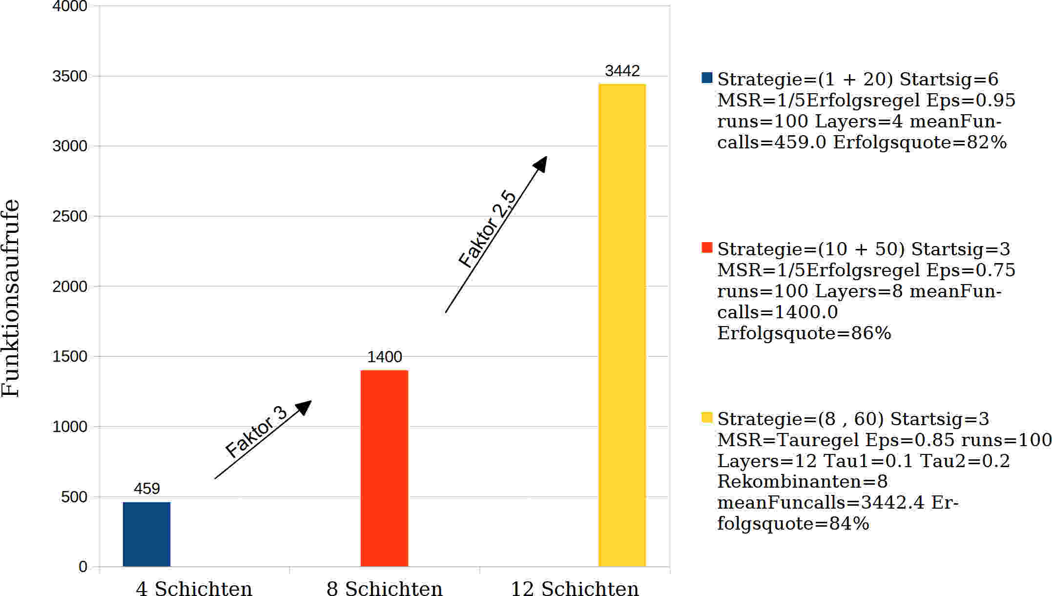 Von Interesse in dieser Arbeit ist insbesondere, wie sich die Parametereinstellungen der Evolutionsstrategie auf die Qualität des Ergebnisses auswirken und für welche Schichtanzahl welche Parameterkonfiguration geeignet ist. Da heuristische Optimierung stark wahrscheinlichkeitsbehaftet ist, werden in dieser Arbeit je Parametereinstellung und Schichtanzahl genau 100 Optimierungen durchgeführt. Das gemittelte Ergebnis gibt dann zuverlässig Aufschluß darüber, wie gut die Parametereinstellung gewählt war. Die Bewertung der Qualität des Ergebnisses wird aus zwei Merkmalen bestimmt: Wichtigstes Bewertungskriterium ist die Menge an gut gelungen Optimierungen, d.h. der Zuverlässigkeit. Es wird in dieser Arbeit eine Erfolgsquote von 80% festgelegt. Mindestens 80% von den 100 Optimierungen dürfen nicht mehr als 10% vom globalen Optimum abweichen (d.h. größer als 1,1 sein, siehe Kapitel 6.4). Darüber hinaus wird darauf geachtet, dass die gemittelte Anzahl der Funktionsauswertungen gering bleibt. Die Anzahl der Funktionsauswertungen ist ein Maß für die Geschwindigkeit und die benötigte Rechenkapazität des Algorithmus. Von allen Parameterkonfigurationen ist schließlich jene die beste, mit der die Erfolgsquote erreicht/überschritten wurde und im Mittel am wenigsten Funktionsaufrufe nötig waren.