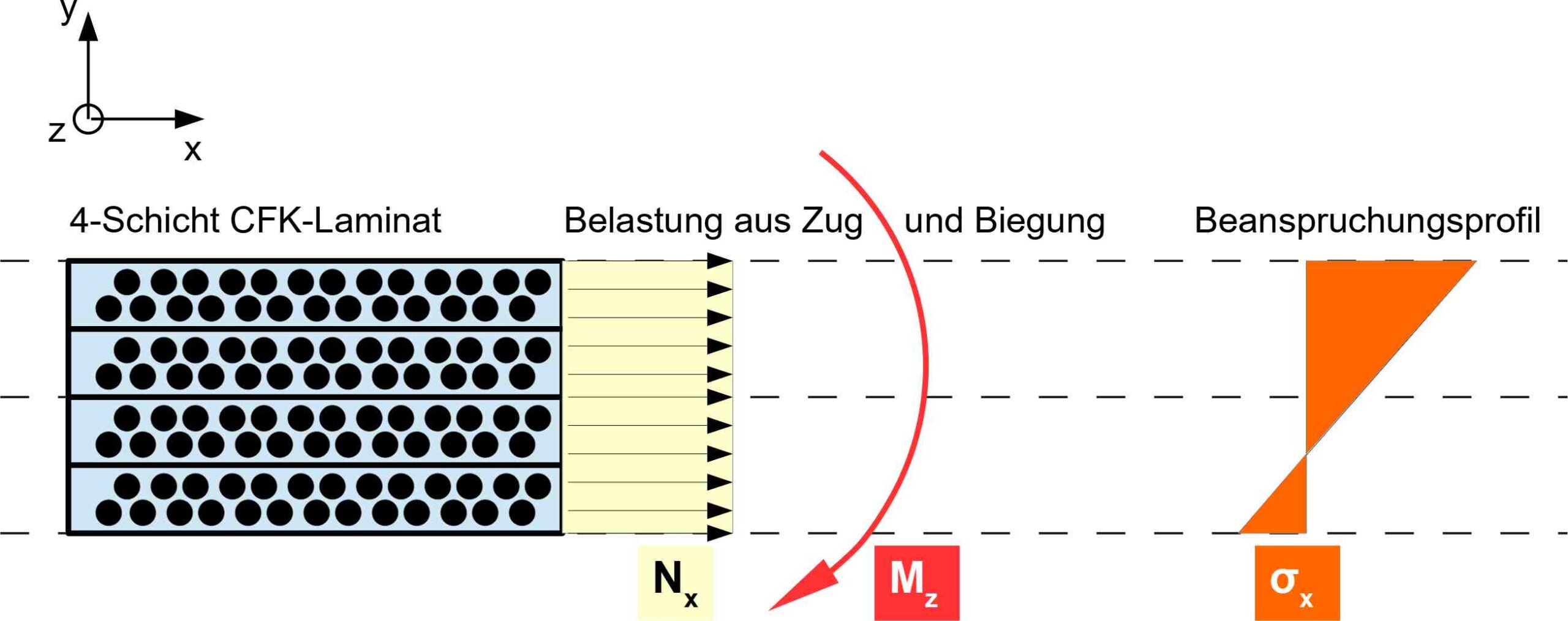 In dieser Arbeit wird ein spezifischer und konstanter Belastungsfall Anwendung finden für den die Lösung bekannt ist. Das betrachtete Laminatmodell wird in dieser Arbeit einerseits monoaxial in Längs-Richtung gezogen und außerdem mit einem Biegemoment um die Achse in Faserrichtung belastet. Hinsichtlich des CUNTZEschen Versagens ist die hier betrachtete Beanspruchungssituation dahingehend normiert, dass bei optimaler Orientierung (wenn alle Schichten in 0° ausgerichtet sind) die Bruchbedingung gerade erfüllt ist und die Beanspruchung ihren zulässigen Maximalwert, der f0 = 1 ist, annimmt.