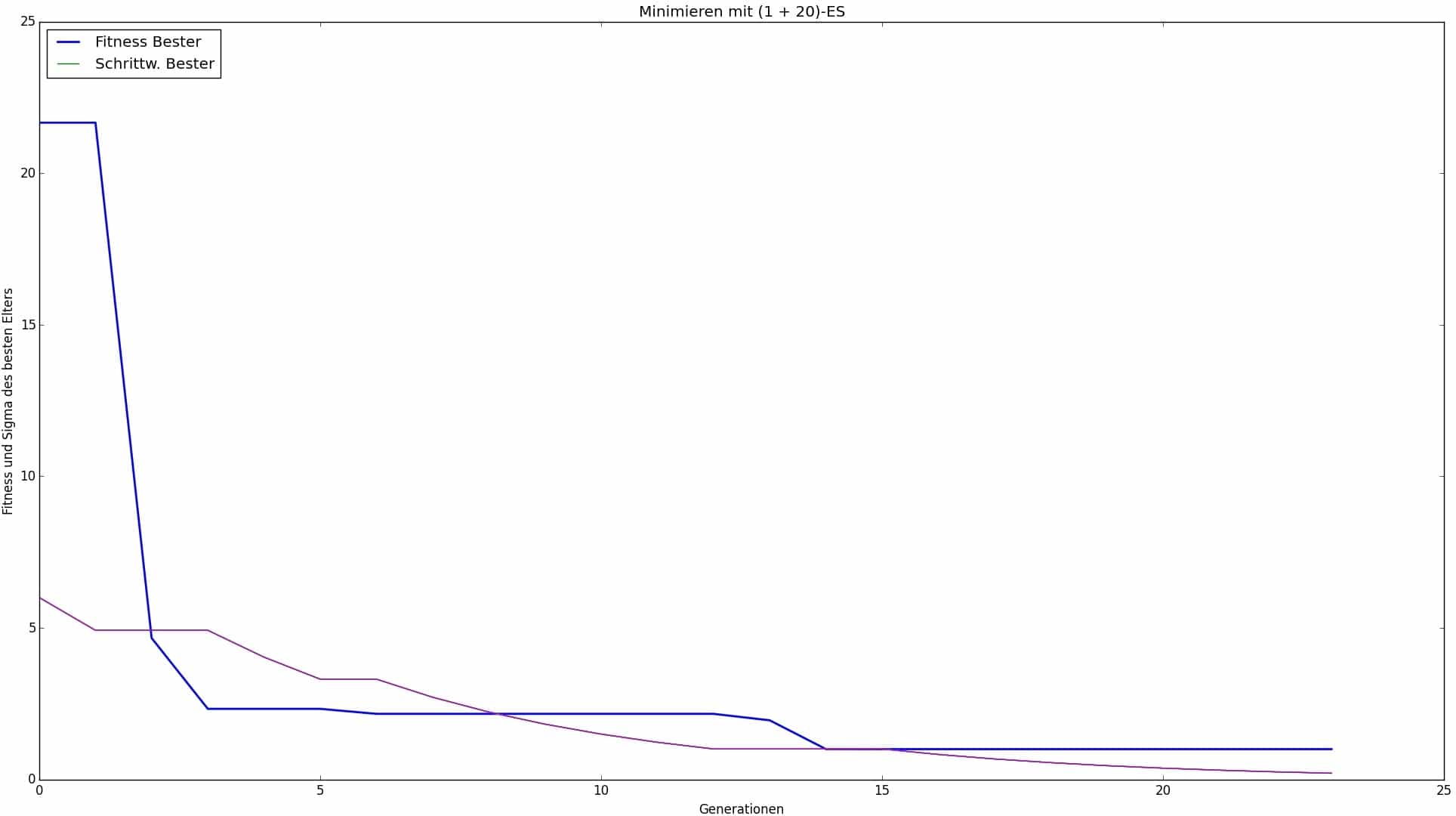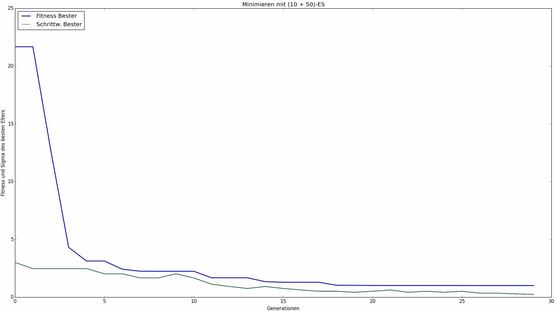 Die Menge von, global betrachtet, 9 Eingabeparametern haben Wertebereiche die mehrheitlich unendlich groß sind (reelle Zahlen allgemein bzw. ganze Zahlen ohne obere Schranke). Von einigen unterschiedlichen und erwähnenswerten Ansätzen wird sich in dieser Arbeit aus zwei Gründen dafür entschieden, zunächst mit (+)-Strategien und 1/5-Erfolgsregel als MSR zu arbeiten. Mit einer solchen ES gibt es die geringste Anzahl möglicher Eingabeparameter, weshalb mit ihr ein guter erster Entwurf einer Parameterkonfiguration gelingen kann. Ferner kann sie dabei helfen, Aussagen über die Beschaffenheit der Zielfunktion zu treffen, was für die Parametereinstellungen anderer ES’en dienlich sein wird. Zum Beispiel kann mit dem Konvergenzverhalten einer (1+1)-ES mit niedrigen Startschrittweiten die nähere Umgebung der Zielfunktion ausgehend von der Startkonfiguration ausgelotet werden; Wird nach wenigen Iterationen ein lokales Optimum gefunden, hat man Aufschluß über seine Existenz (es existiert), seine Ausprägung (Funktionswert wiedergeben lassen) sowie seine ungefähre Entfernung (nah).