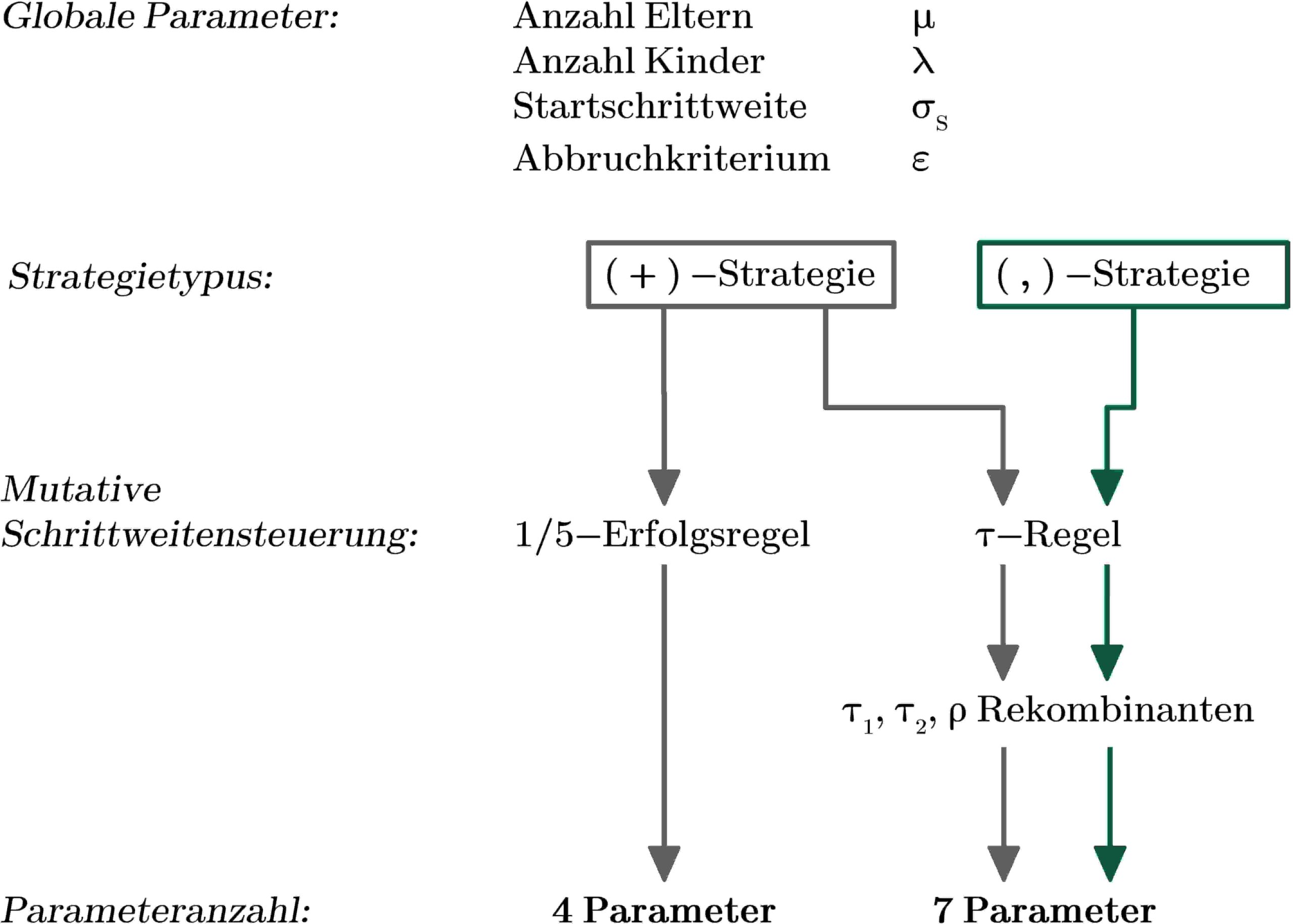 In dieser Arbeit werden (μ/ρ +, λ)-ES‘en verwendet (sprich: „mü durch rho plus komma lambda Evolutionsstrategien“). Dabei steht