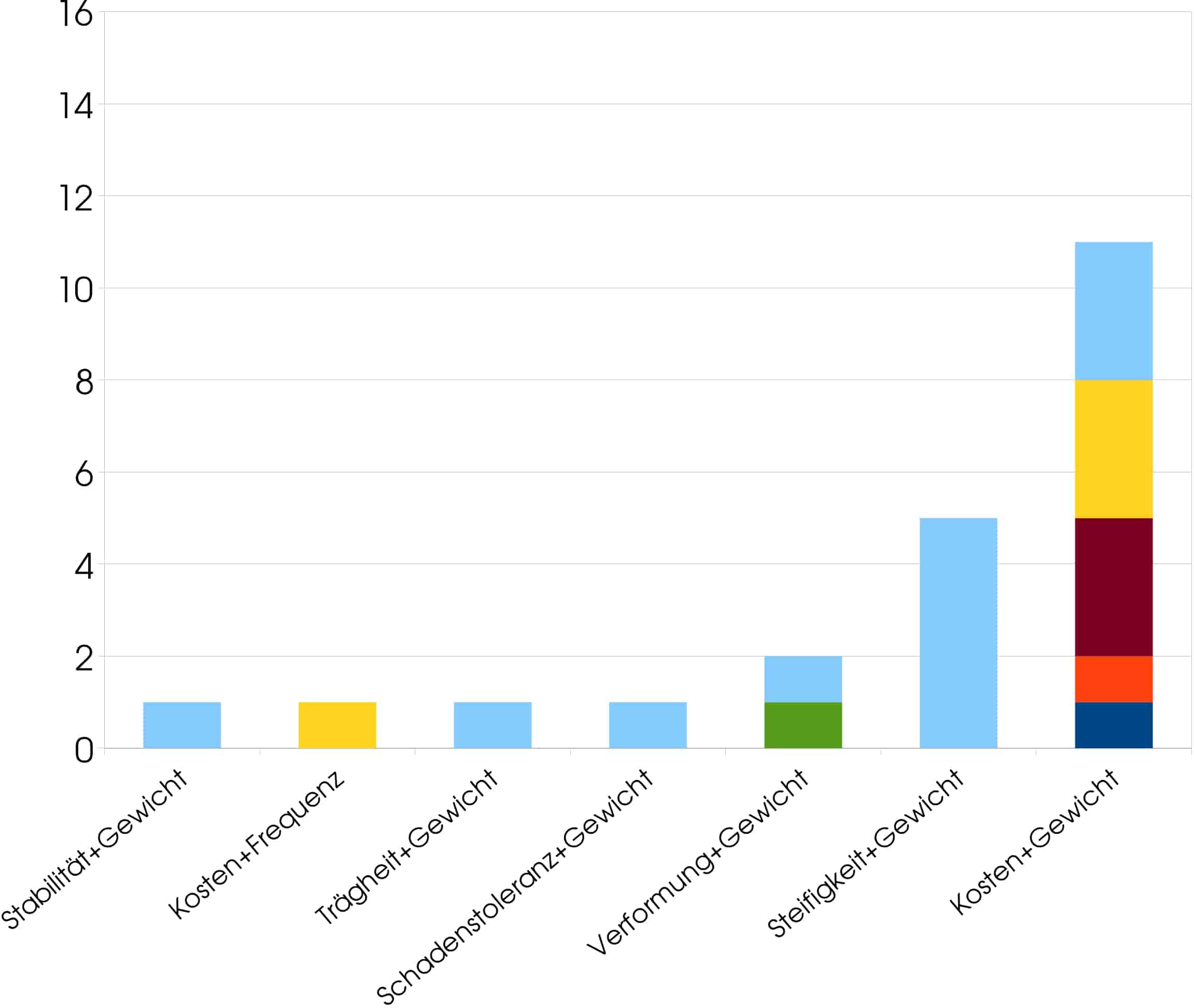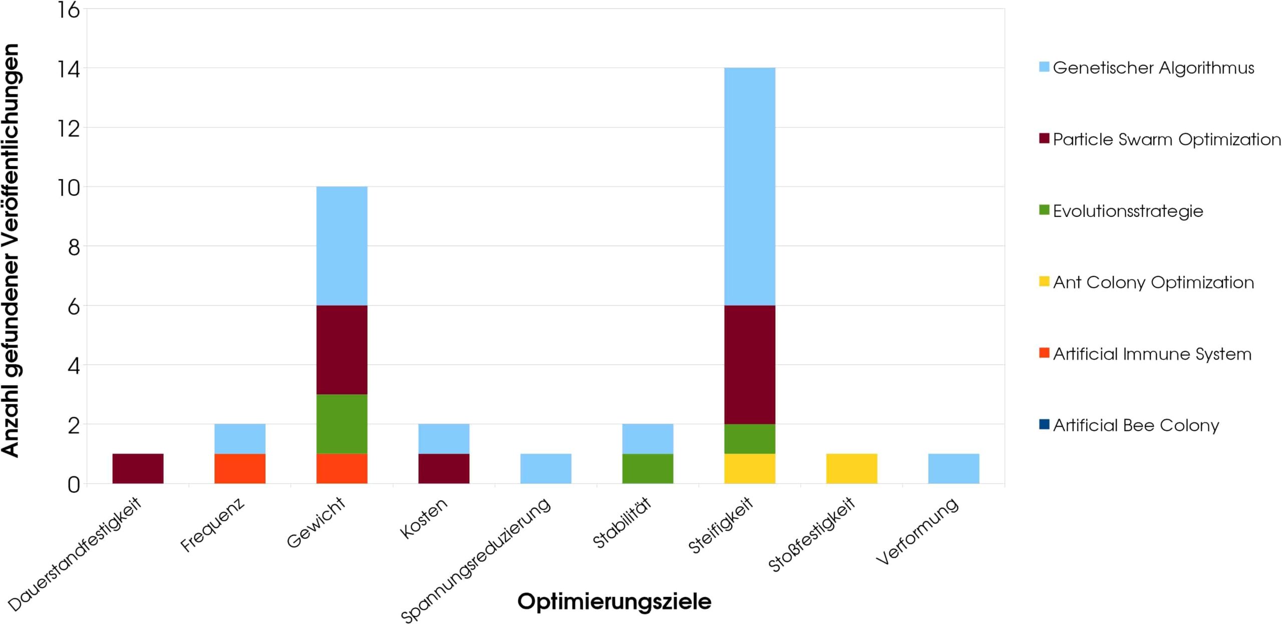 Es wurden insgesamt 56 Veröffentlichungen gefunden, die jeweils eine der genannten Optimierungsverfahren angewendet haben. Die Optimierungsziele hierbei waren: Dauerstandfestigkeit, Frequenz, Gewicht, Kosten, Spannungsreduzierung, Stabilität, Steifigkeit, Stoßfestigkeit, Verformung sowie, je einmal bei der Mehrzieloptimierung angewandt, Trägheit und Schadenstoleranz. Diese Optimierungsziele sind typisch für den Bereich des Maschinenbaus und daher nicht verwunderlich. Die Häufigkeit der angewandten Algorithmen ist sehr unterschiedlich und gleichfalls nicht sehr überraschend. Bei der einfachen Optimierung dominieren die Ziele Steifigkeit und Gewicht stark, was angesichts dessen, dass es sich hier um eine Leichtbautechnologie handelt, plausibel ist. Nicht zu erwarten war, dass das Ziel der Kosten wenig Beachtung findet, da doch die hohen Kosten eine der größten Herausforderungen bei Herstellung und Verarbeitung von Faserverbunden ist. Bei der Mehrzieloptimierung jedenfalls ist das anders; hier wird den Kosten gemeinsam mit dem Gewicht die größte Häufigkeit aller Optimierungsziele zuteil. Am zweithäufigsten ausgeprägt sind Steifigkeit und Gewicht. Die restlichen Zielkombinationen sind im Vergleich zu diesen beiden marginal.