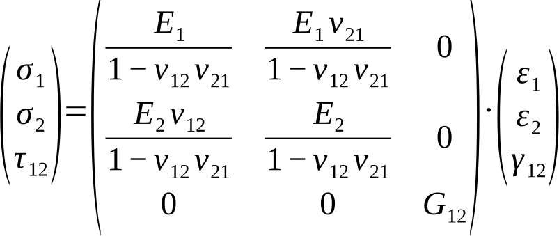 Zunächst werden die vier unabhängigen Materialkennwerte jeder Schicht, die sich aus ihren transversalisotropen mechanischen Eigenschaften ergeben ermittelt, indem man mikromechanische Modelle anwendet, Versuche durchführt oder sie der Literatur entnimmt. Hiermit kann nun je Schicht die sogenannt „lokale“ Steifigkeitsmatrix aufgestellt werden, in der die 1-Richtung die Faserrichtung kennzeichnet und die 2-Richtung jene senkrecht zur Faserrichtung. Die Steifigkeitsmatrix lautet damit: