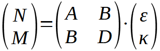 Damit ist die Beschreibung der Spannungs-Dehnungsbeziehung der Schichten sowie deren Drehung in ein gemeinsames, globales Koordinatensystem vollzogen. Anschließend wird mittels der statischen Gleichgewichtsbedingungen die sogenannte ABD-Matrix aufgestellt, die die Zusammenhänge von Schnittgrößen (Kraft- und Momentenflüsse) mit den Dehnungen und Wölbungen des Laminats ausdrückt. Der Name stammt aus dem Umstand heraus, dass diese Matrix zu viermal je 3×3-Matrizen besteht, und zwar aus einmal einer A-Matrix, die die Eigenschaften der Scheibe darstellt, einmal einer D-Matrix die die Eigenschaften der Platte repräsentiert und zweimal einer B-Matrix, die die Kopplung von Schnittkräften und –momenten bzw. Dehnungen und Wölbungen beschreibt. Mit N für die Schnittkräfte, M für die Schnittmomente, ε für die Dehnungen und κ für die Wölbungen ergibt sich diese Beziehung zu: