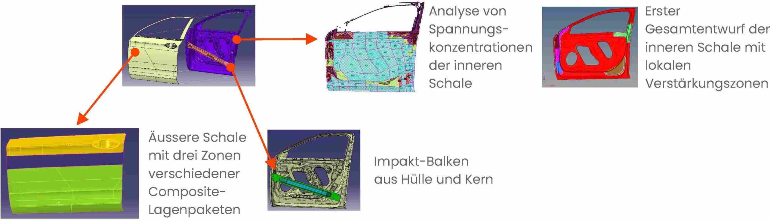 Ein Automobilhersteller ließ untersuchen, ob die Masse seiner PKW-Tür deutlich reduziert werden könnte. Aufgabe war, die konventionelle Tür in eine Leichtbauweise zu überführen unter Berücksichtigung struktureller Randbedingungen und insbesondere der Crashaufnahmefähigkeit sowie der Kosten.